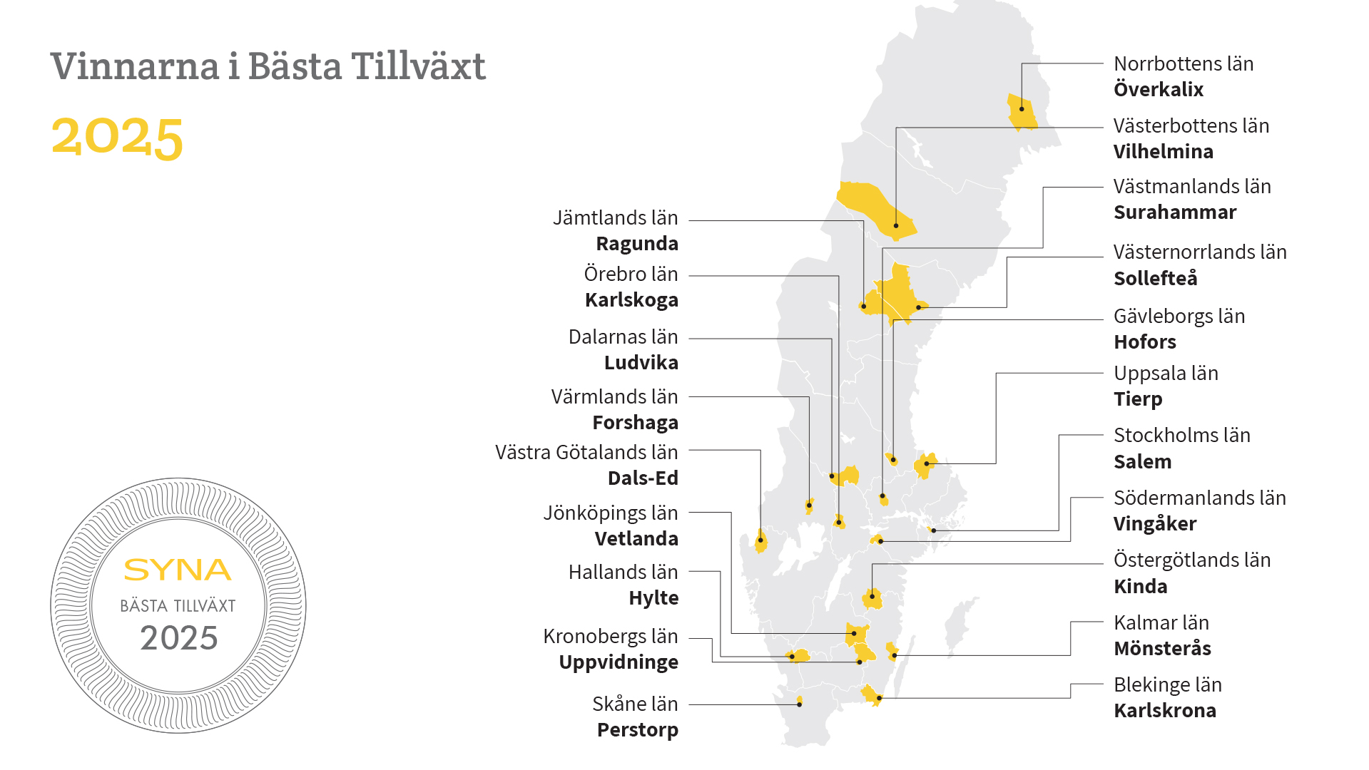 Varje år delar Syna ut priset Bästa Tillväxt till den kommun i varje län där företagen växer bäst. Syna granskar boksluten från alla svenska aktiebolag, och utmärkelsen går till den kommun som har störst andel företag som nyanställer, ökar sin omsättning och går med vinst.