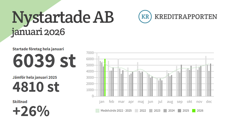 Att antalet nystartade företag ökar är ytterligare en signal på en växande framtidstro. I januari registrerades 6 039 nya aktiebolag, en ökning med 26 procent jämfört med samma månad förra året. Noterbart är också att det är den högsta siffran för januari de senaste fyra åren. Se nystartade företag i ditt län: https://kreditrapporten.se/nystartade-foretag-januari-2026